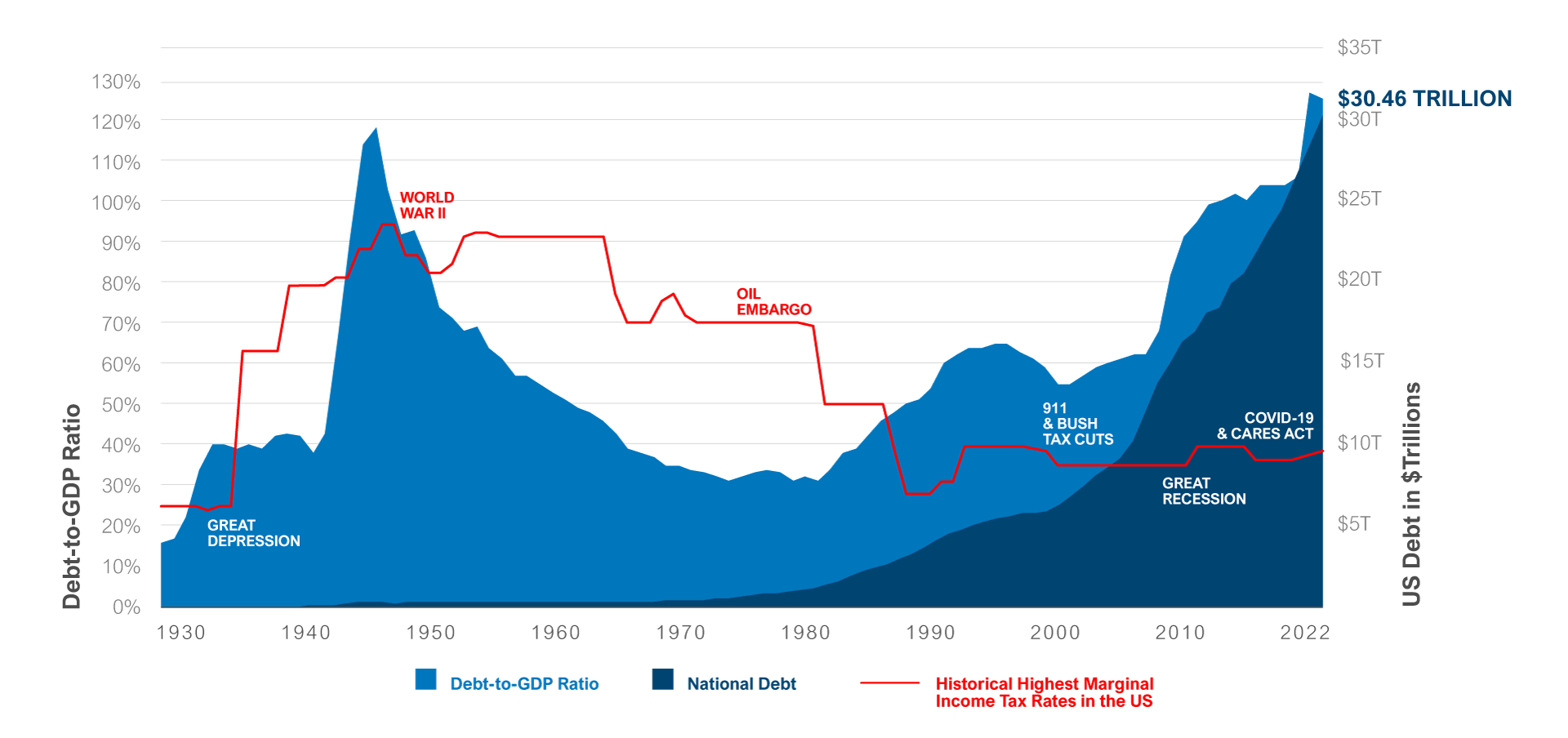 Debt-to-GDP is a leading indicator of income tax increases in US. Almost half (47%) of Americans expect their taxes to go up significantly in the next four years.